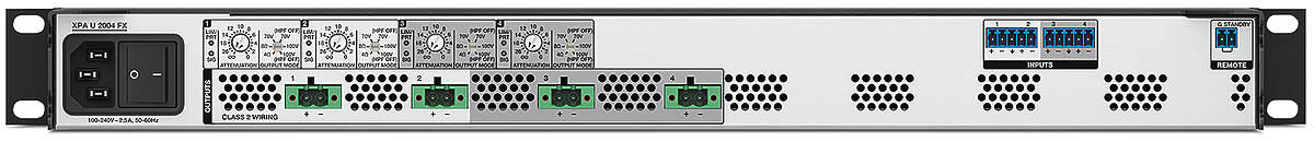 Output modes can be independently configured per channel for 8 ohm, 4 ohm, 70 volt or 100 volt operation, with the option of adding a high pass filter in 70V or 100V mode. This allows a single XPA U 2004 FX amplifier to drive multiple types of speakers simultaneously, saving cost and space.