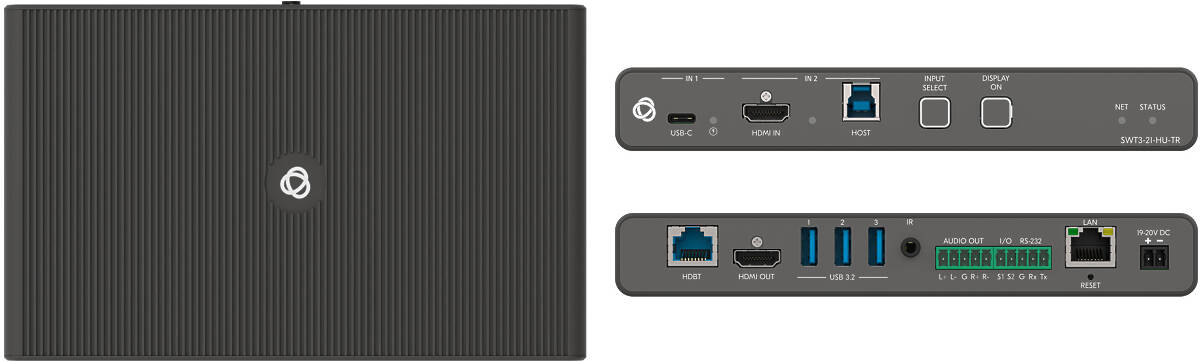 The Kramer SWT3 31 HU TR is a high-performance auto-switcher with one USB-C and two HDMI/USB inputs, HDMI output and extended-range HDBaseT 3.0, flexibly set for transmit (output) or receive (input) link, for extension of 4K60Hz (4:4:4) HDMI, USB 2.0, Ethernet, RS-232, IR and power signals over twisted pair cable. The local and remote connected USB peripherals, such as a room camera and microphone, are switchable for use of the switcher active USB host, for convenient hybrid meeting operation with both room and online participants.