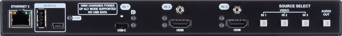 The device utilizes the USB-C connectivity for a simplified transmission of 4K video, audio, and power, allowing video resolution capabilities up to 5K (5120×2160) via HDMI 2.0 at 30Hz 4:4:4 or 60Hz 4:2:0, as well as 4K@60Hz at 4:4:4. Users who connect their laptop or other mobile device via USB-C can also enjoy charging up to 100W, thus eliminating the need to look for a wall plug and to avoid sudden interruption of meetings.