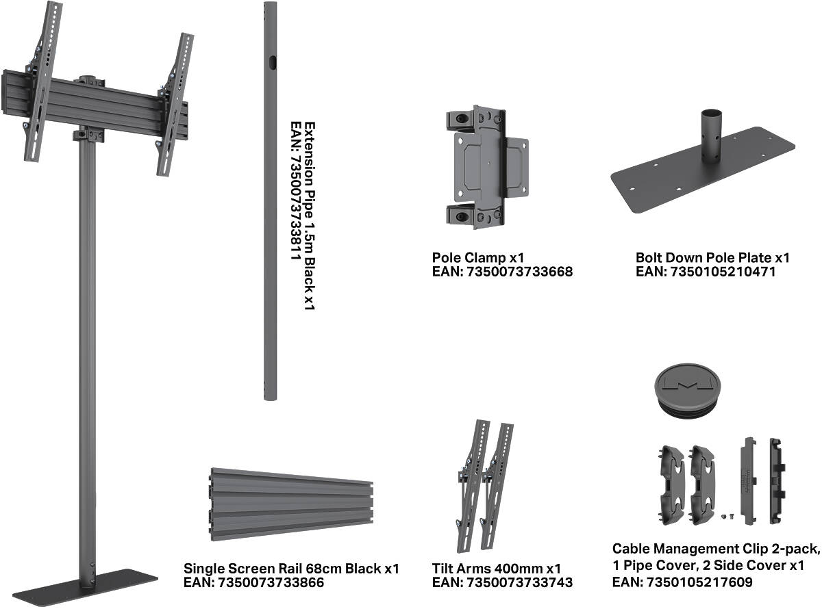 This versatile mount features a robust 1.5m vertical pole and sleek black finish, making it ideal for retail, corporate or signage use. With a flexible design and support for future reconfiguration, its the perfect choice for dynamic A/V projects.