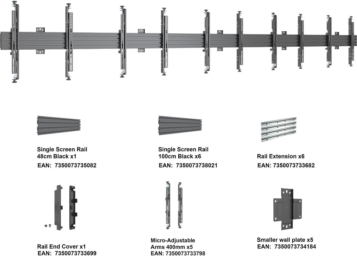 M Wallmount Pro MBW5U Micro Adjustable Black is a professional wall mount for 5 displays in landscape or portrait mode. Designed for 32–75″ screens and loads up to 35kg per screen, it enables seamless multi-screen configurations with precise micro-adjustment features — perfect for digital signage, video walls, or menu boards.
