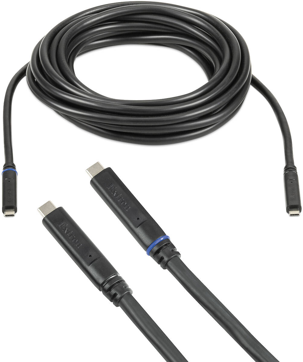 The Extron USBC ProMax Series of active, hybrid optical-copper USB‑C® cables simultaneously transmit video, audio, data, and power up to 9.1 metres. This USB 20Gbps cable features dynamic DP Alt Mode lane switching for optimal 2-lane or 4-lane video and USB operation. It supports DisplayPort Alt Mode 8K video with USB 2 data rates, and 4K video with USB data rates up to 10 Gbps. Additionally, 100 watt USB Power Delivery enables powering of laptops and mobile devices. Descriptive text and a blue-coloured ring on the host connector allow for easy identification of cable directionality, reducing the likelihood of improper connection.