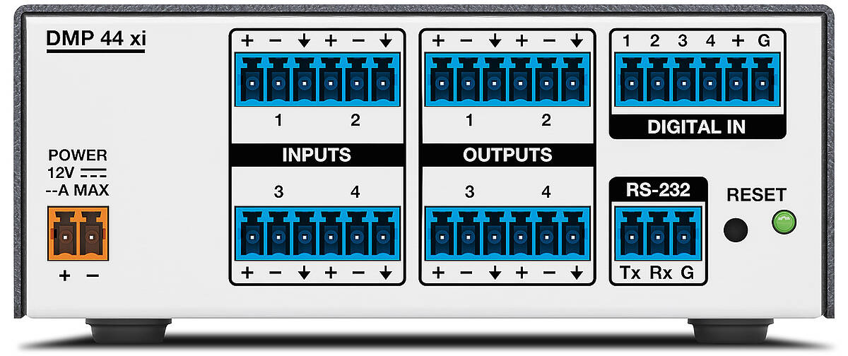 - 4x4 line level audio matrix mixer - The DMP 44 xi is a compact matrix mixer with DSP. It features four line level inputs that can be processed, mixed, and routed to four line level outputs.