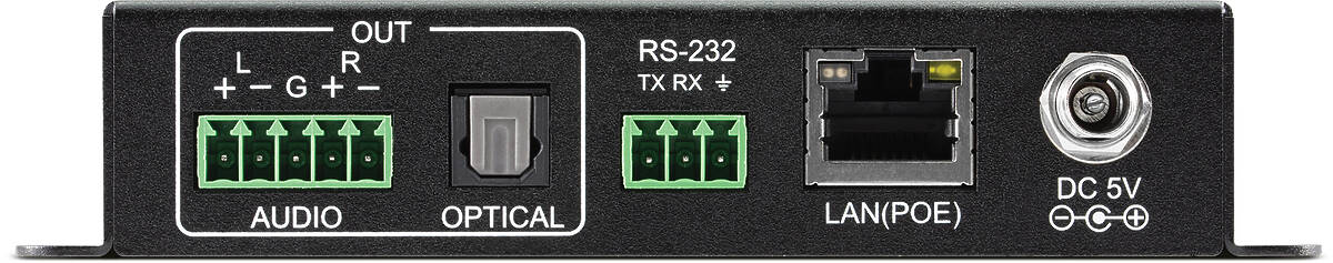 1 × RJ45, 1 × 3-pin Phoenix inputs; 1 × TosLink, 1 × 3-pin Phoenix Analogue Stereo Output