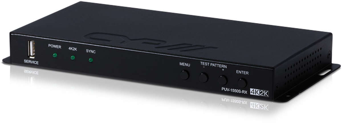 The CYP PUV-1550SRX Receiver supports video resolutions up to 4K UHD along with HD audio, 2-Way IR, RS-232, PoC (Power over Cable), LAN and Optical Audio Return (OAR) over a single Cat5e/6/7 cable up to 100m.