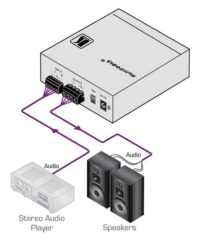 | Output | 1 x balanced stereo audio (speakers) on a terminal block connector |
