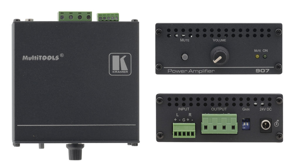 The Kramer 907 is a high performance power amplifier for line-level stereo audio signals. It accepts a balanced stereo audio signal on a terminal block connector and delivers 40 watts per channel into an 8Ω load.