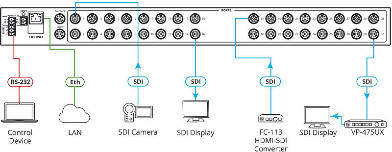 | Ports | 32 × 12G-SDI/3G-SDI/HD-SDI/SDI Video 75Ω on BNC connectors (by default, 1 to 16 are set as inputs and 17 to 32 are set as outputs) |
