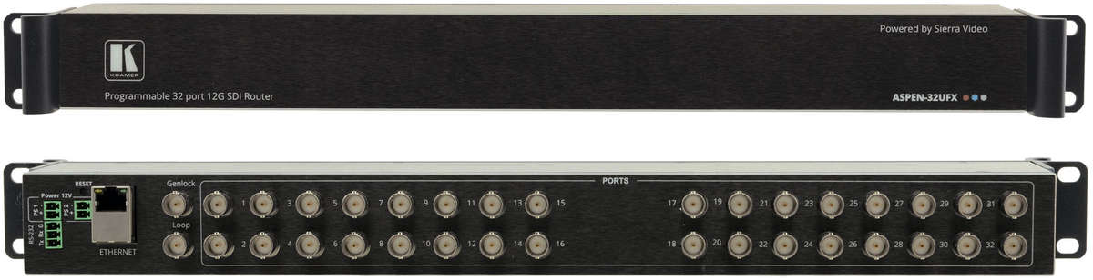 The Kramer ASPEN-32UFX is a 32-port matrix switcher for SDI signals of up to 12G SDI. Each SDI port can be defined as either an input or output, enabling flexible configurations such as a 1x31 distribution amplifier, 31x1 switcher, 16x16 matrix switcher or any other possible input-output combination. ASPEN-32UFX is easy to operate and control through the network using the intuitive web pages and through RS-232 using a serial controller.