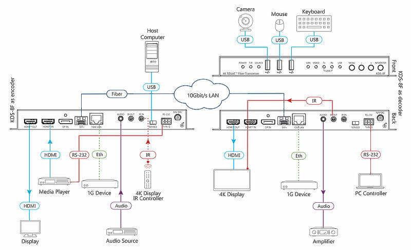 The Kramer KDS-8F is a high performance, zero latency, 4K@60Hz (4:4:4) video streaming transceiver for streaming via Ethernet over single-mode and multi-mode optical fiber. KDS-8F can be set as either an encoder or decoder. As an encoder, it encodes and streams the HDMI or DisplayPort input along with IR, RS-232, Analogue audio and USB, over an IP network. As a decoder, it receives the encoded signal and decodes it for output.