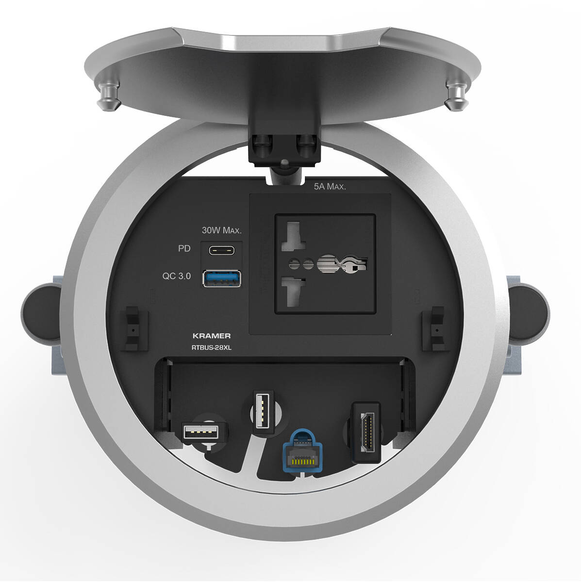 The Kramer RTBUS-28XL is an elegant furniture-mounted, round-connection bus. The RTBUS-28XL features a mechanism for pneumatic lifting and smooth closing of its lid. It is easily installed into a table or podium top. In addition, the unit connects AV equipment to the room's presentation system.