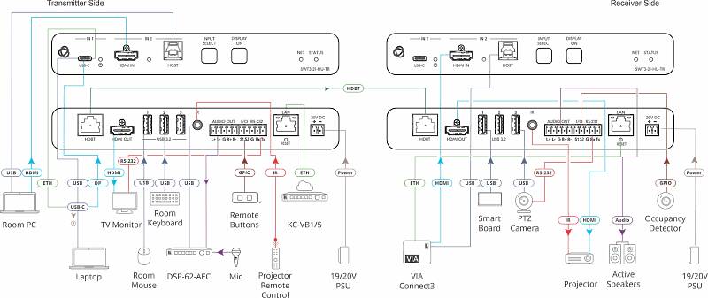 - Hybrid–meeting Collaborative Switching — Controllable coupled–signals switching of both AV and USB host inputs, for concurrent connection with AV output and space USB devices, allows collaborative hybrid meeting where multiple meeting participants are switched to share their content with both room and online meeting participants.