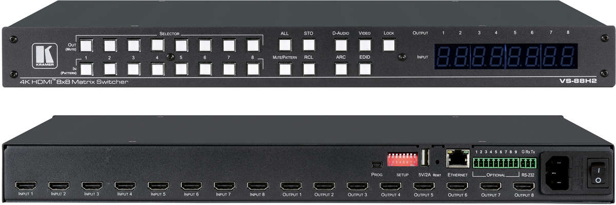 | Kramer VS-88H2A | 8 × 8 4K 4:4:4 HDMI 2.0 Matrix Switcher with Analogue and Digital Audio Routing 8 × HDMI inputs; 8 × HDMI outputs; Max. bandwidth 18Gbps | £3351 | £4021.20 |