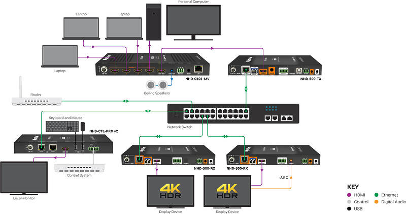 Choose to use this switcher as a stand-alone multiview processor or pair it with a NetworkHD system. For a stand-alone solution, connect source devices directly to the four HDMI inputs and a display to the HDMI output. Or connect the switcher to a network switch with a NHD-CTL-PRO and link it to NetworkHD 400 or 500 series encoders & decoders.