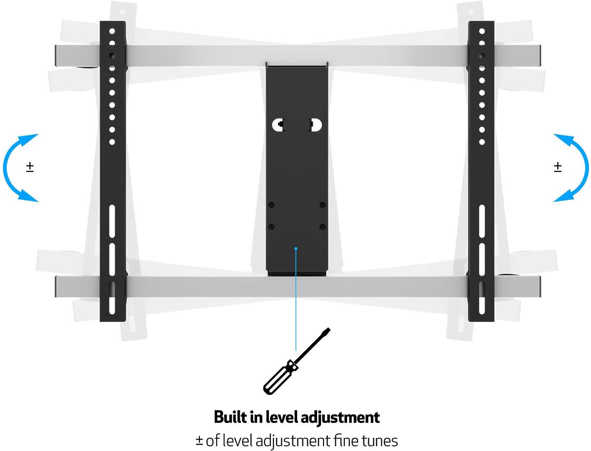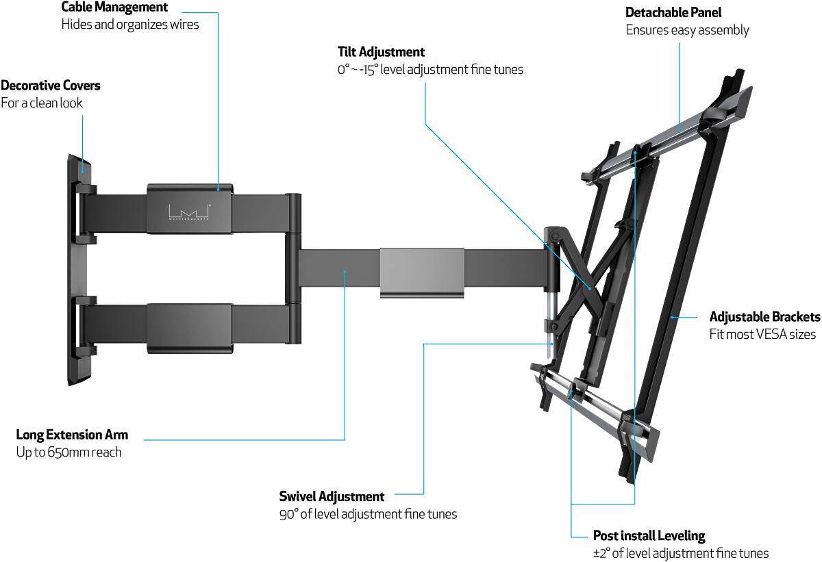 Supporting TVs from 37–65″ and weighing up to calcMaxLoadText}, this mount delivers an exceptionally flexible viewing experience. Easily tilt the screen up to 0–15°, swivel ~±90° (screen size dependent), and fine-tune the level by ±7° after installation. Thanks to its full-motion capabilities, you can eliminate glare and optimize the viewing angle from any spot in the room.