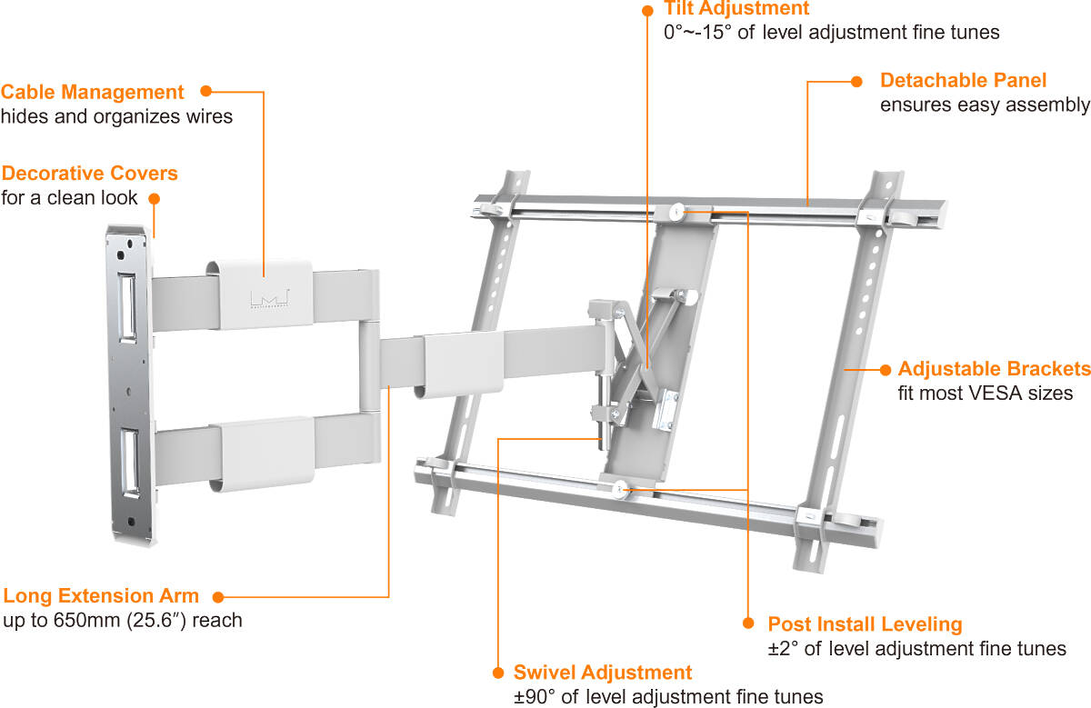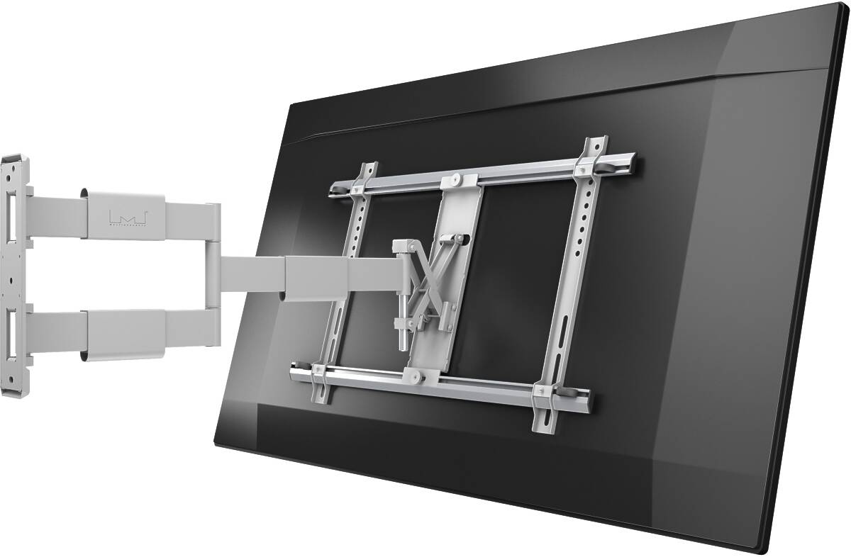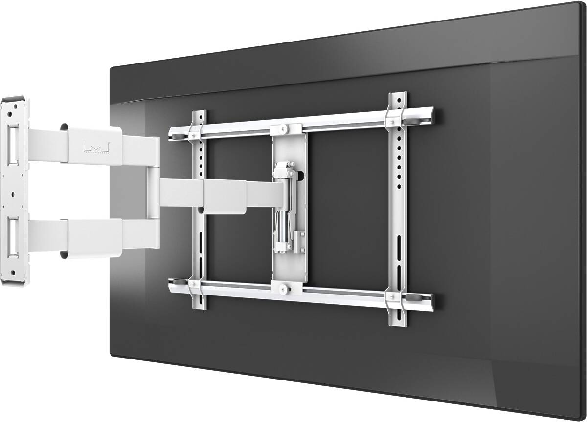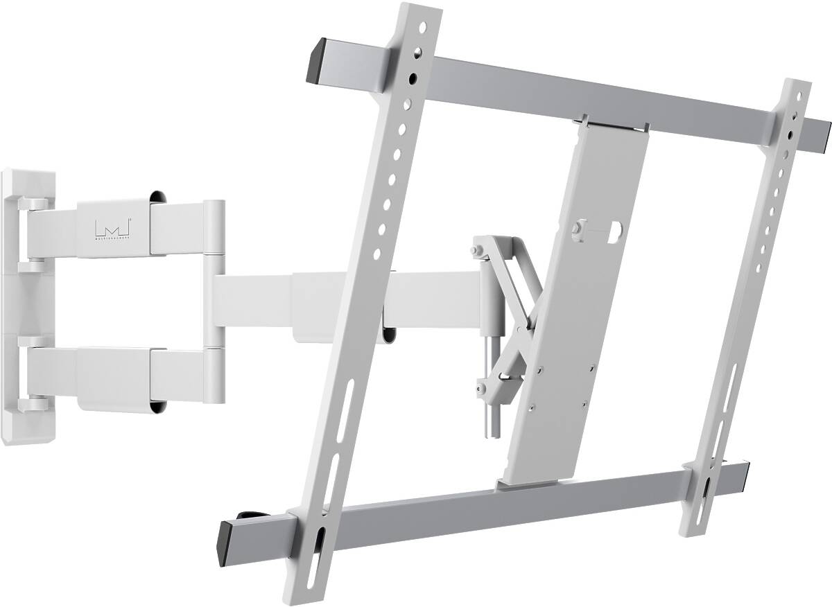 The M VESA Flexarm Thin White Large is a sleek and full-motion TV wall mount that matches today’s ultra-thin displays in both form and function. With an ultra-slim 40 mm profile and extension up to 650 mm, this mount is engineered for flexibility without compromising aesthetics—perfect for residential, commercial, or office environments.