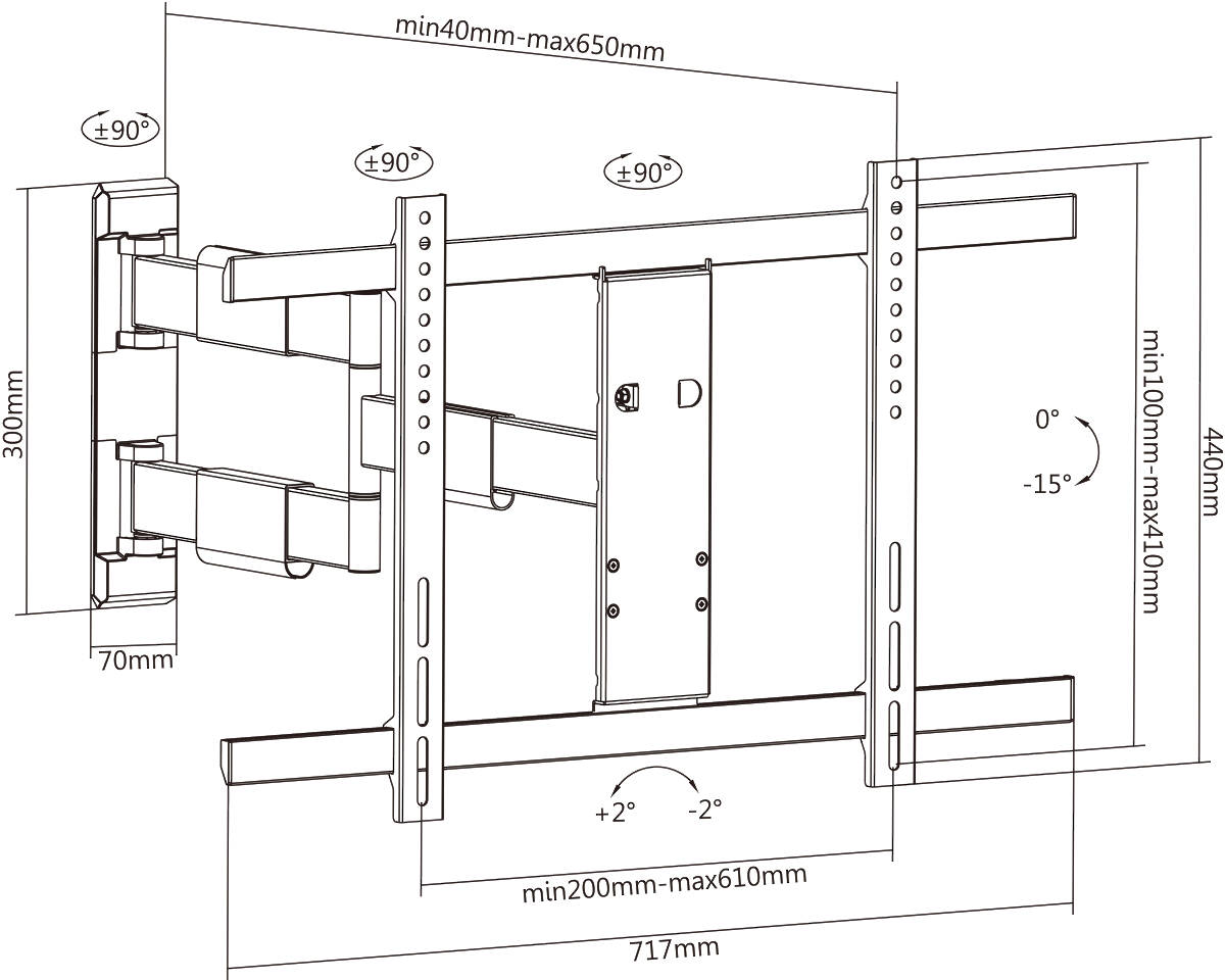 Designed to fit VESA measurements 200×200, 300×200, 200×300, 400×200, 200×400, 300×300, 500×200, 600×200, 400×300, 300×400, 500×300, 400×400, 600×300, 500×400 and 600×400.