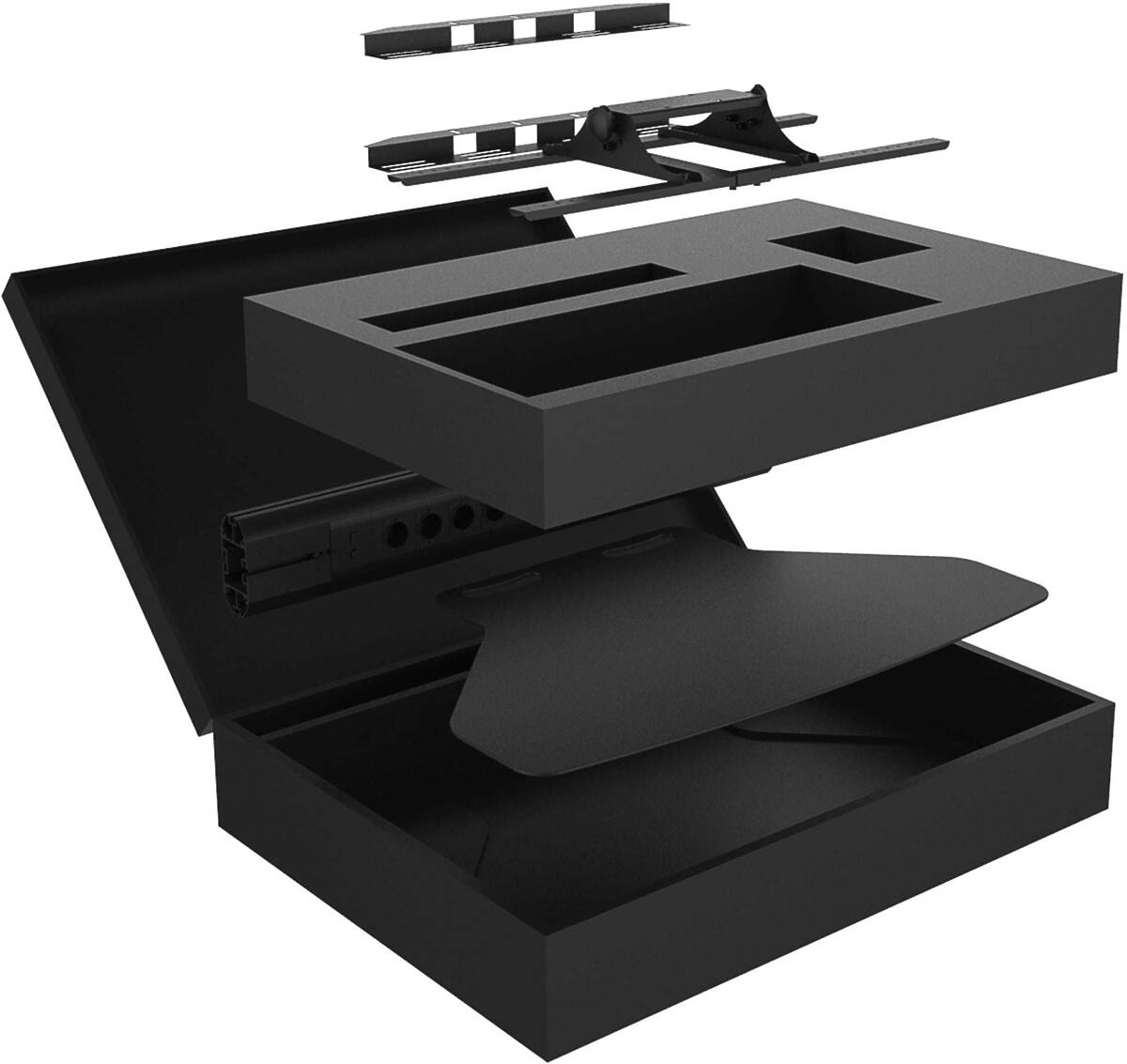 Everything you need to assemble this unit is neatly packed into the flight case, with some spares. As with the standard Public Display stand the M Public Display Stand Tilt & Table 110 has a built in 220V power rail and cable management.