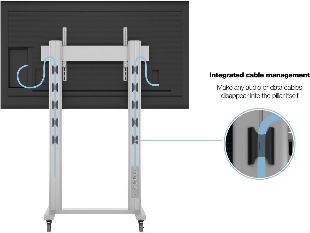 The built-in 220V power rail makes it easy to connect the screen and accessories without cable clutter. With access to a wide range of accessories, including shelves, camera mounts, and brochure holders, the solution can be fully customized to meet your needs.