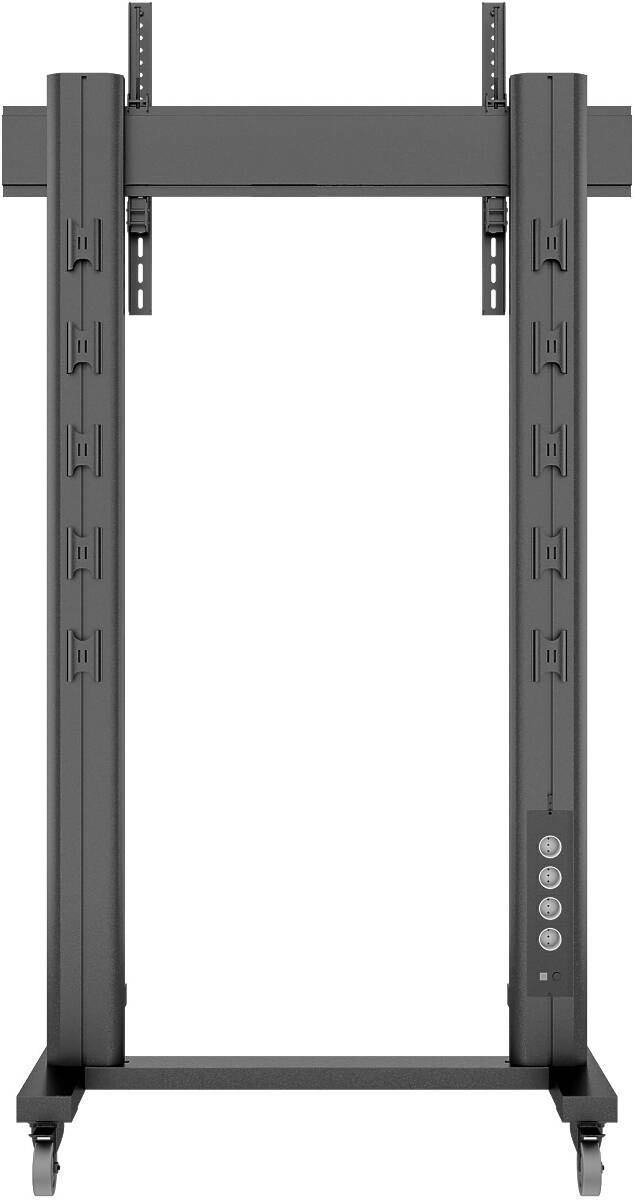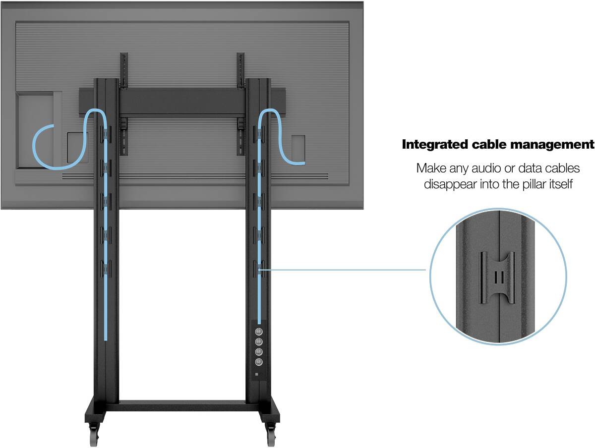 The built-in 220V power rail makes it easy to connect the screen and accessories without cable clutter. With access to a wide range of accessories, including shelves, camera mounts, and brochure holders, the solution can be fully customized to meet your needs.