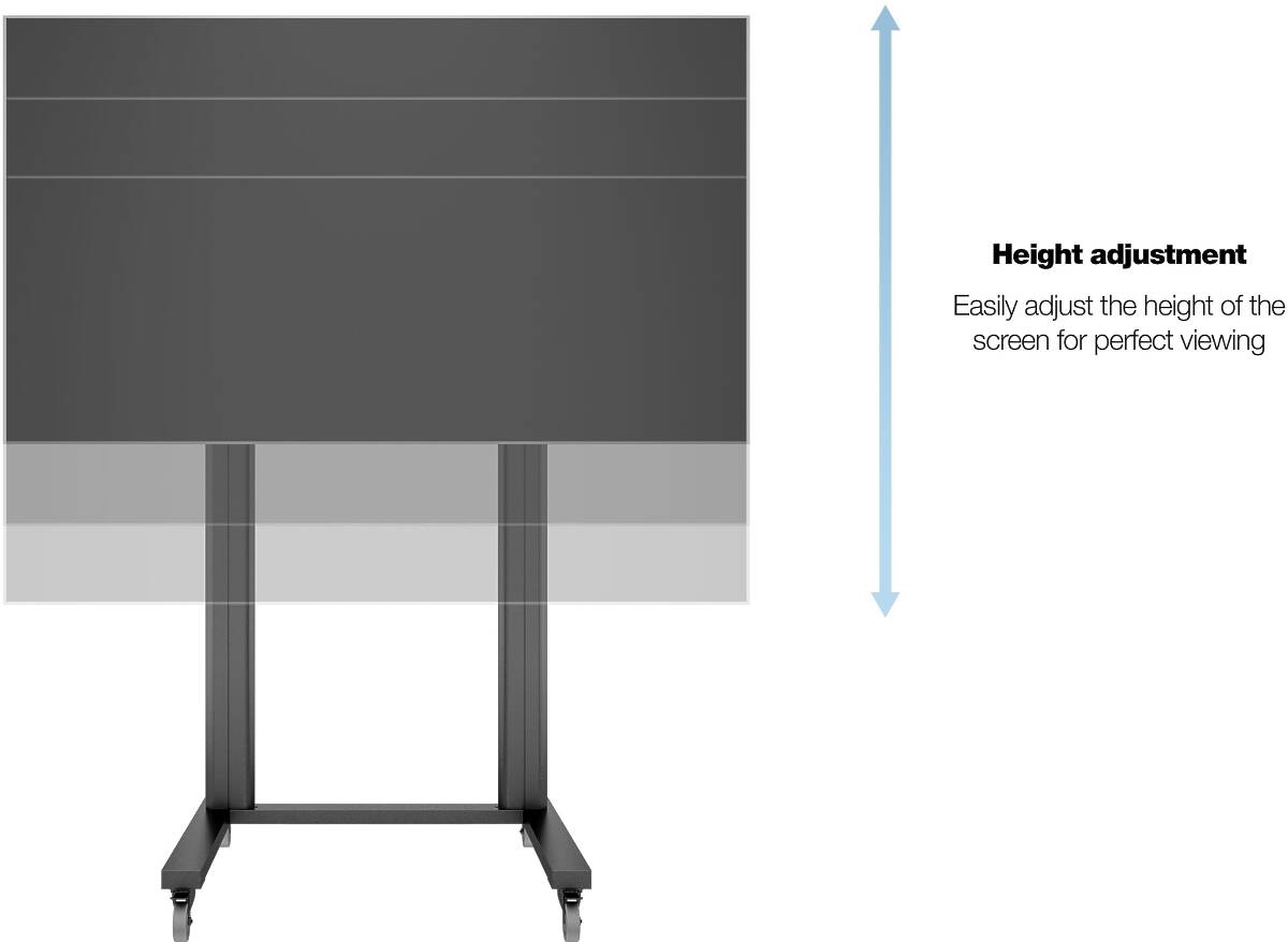 Multibrackets M Display Stand 210 Dual Pillar Wheelbase is a robust and flexible floor stand designed for large screens up to 115" and 125 kg. With a height of 210 cm, this model provides an optimal viewing angle for both seated and standing audiences in conference rooms, classrooms, lobbies, and trade shows.