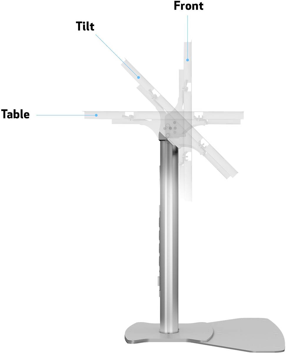 Place your new touchscreen as a table. Present your projects with the display tilted toward any viewer. Use the stand as a presenter for a product or interactive presenter. Make your presentations more interactive by providing new flexibility for a display or touch displays. With its simple-to-use tilt function, and easy movable transport, makes this the ideal solution for educational sector, TV studios and just about any company.