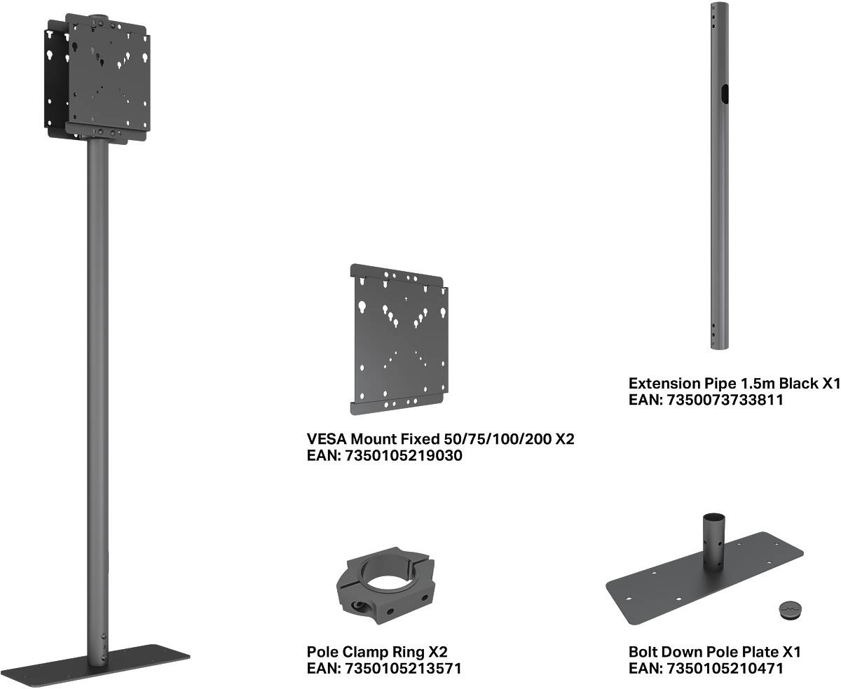 The Multibrackets Pro Series Floormount Pole 50/75/100/200 B2B is a modular and dual-sided floor stand designed for demanding digital signage environments. Built on the trusted Pro Series platform, this solution supports two screens back-to-back and VESA compatibility up to 200x200, offering full flexibility for public installations in retail, transportation, or corporate spaces.