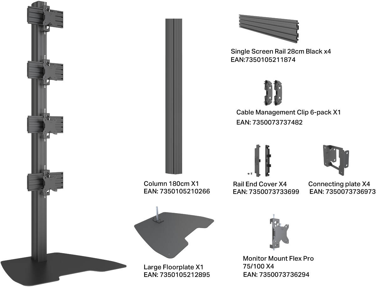 The Multibrackets M Floorstand Column Pro MBFSC4U 180 is a professional, modular floorstand designed for 15–32″ LCD displays in commercial and public environments. As part of the Multibrackets Pro Series, it delivers premium build quality, Scandinavian design, and high configurability – ideal for signage, retail, corporate, and exhibition spaces.