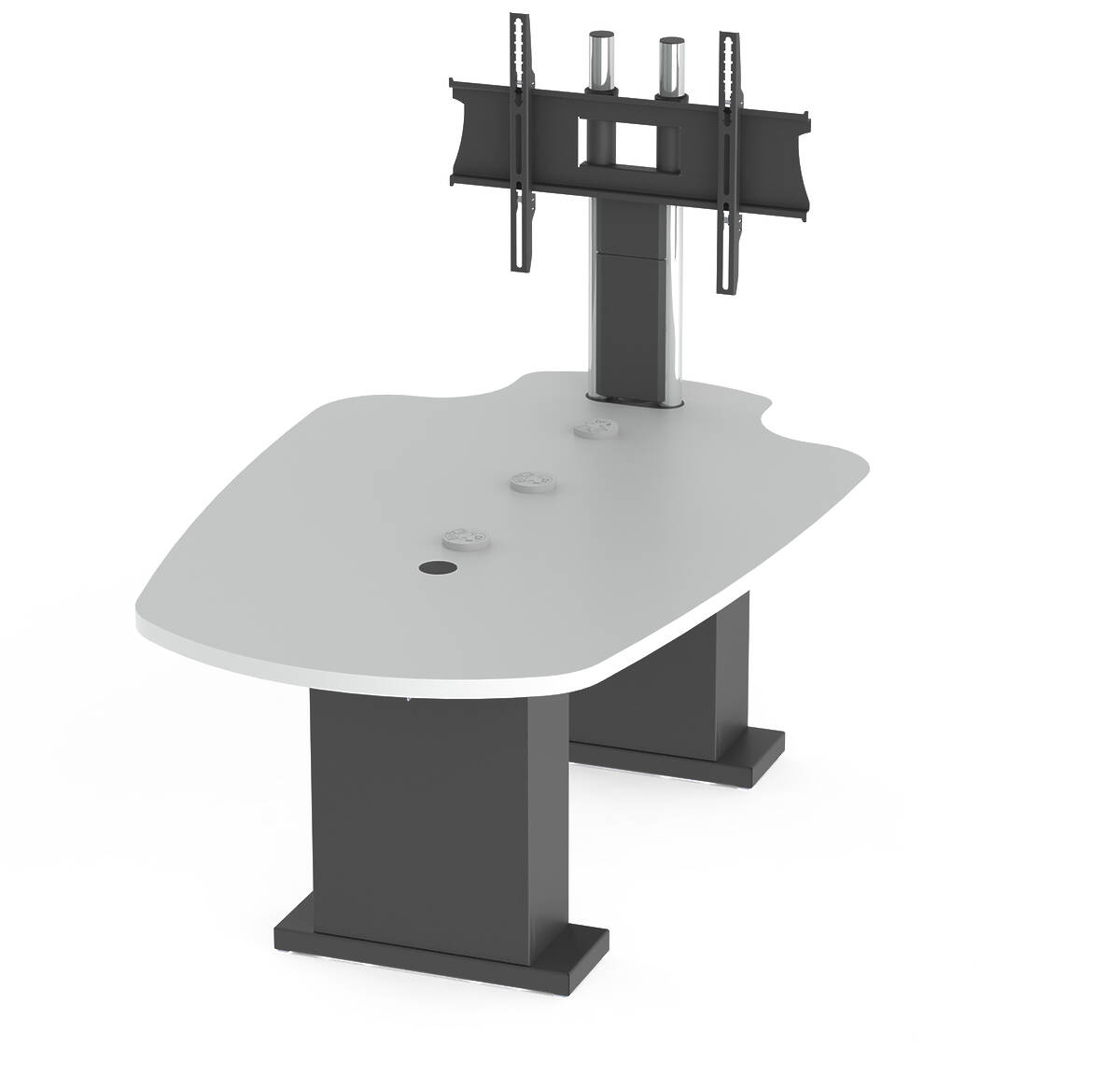 The Huddle and Stand-to-Meet collaborative tables, designed to integrate seamlessly with AV furniture, allow users to host quick & connected seated or standing meetings efficiently. The Huddle can be powered up and down to adjust the height, giving you the option of either seated or standing meetings with the push of a button. The Stand-to-Meet is a fixed height collaborative table, perfect for brief meetings or hot-desking, and a prime example of functional AV furniture.