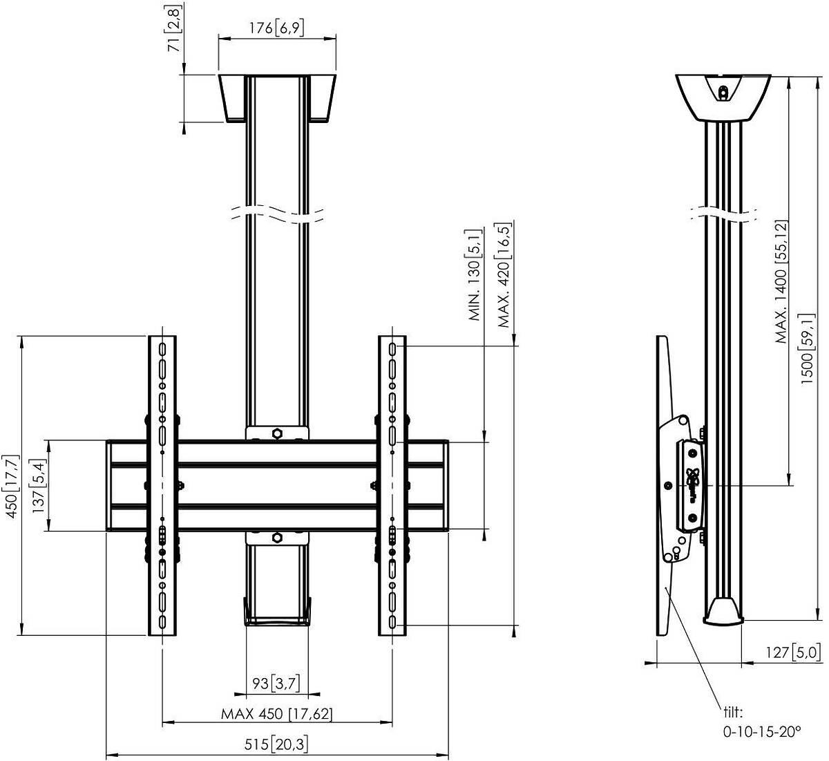Up to 65″/ Max 80kg; VESA 100×100–400×400; 140cm ceiling to screen centre; Black finish